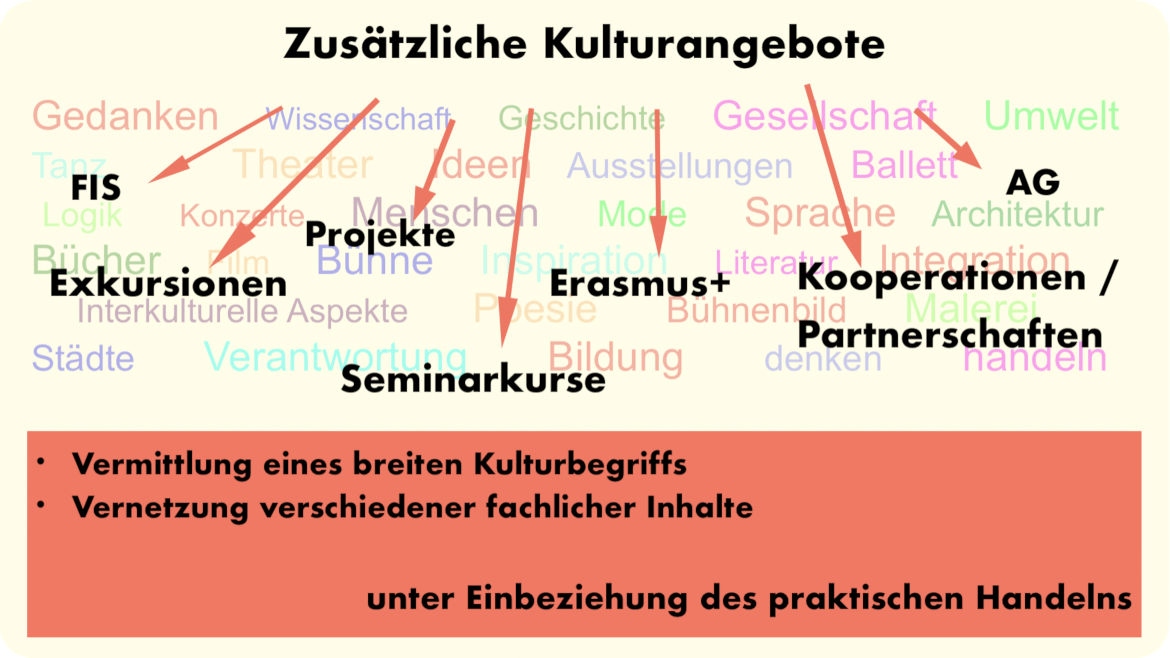 Die praktische Musikstunde in Klasse 5, Unterstufenchor und -orchester, FIS-Angebote in Kunst zum Erlernen und Vertiefen verschiedener künstlerischer Arbeitsweisen, Theater-AG und Fremdsprachentheater, Oberstufenchor, Schülersinfonieorchester (SSO), Angebote aus dem Fachbereich Geschichte in Kooperation mit verschiedenen Museen und das europäische Erasmus+ Programm.
