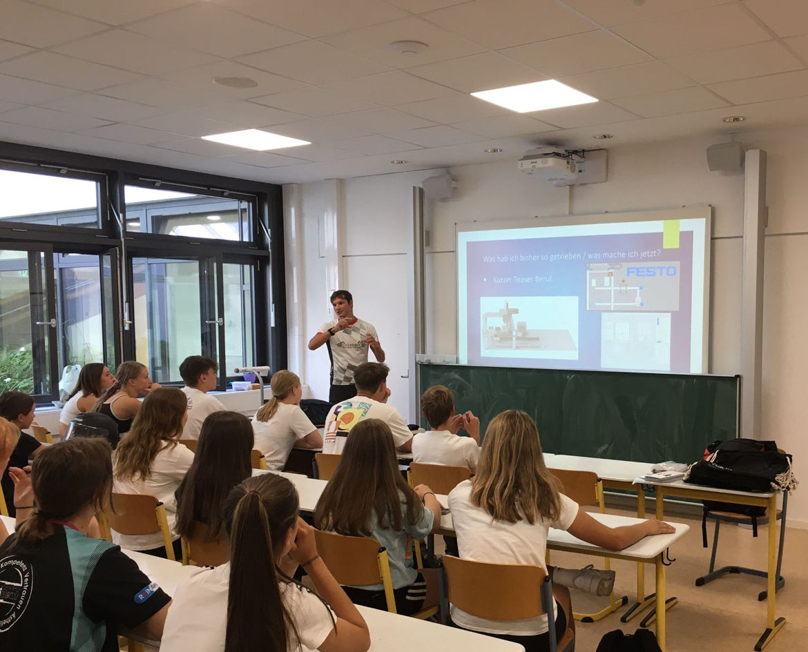 Einen ganz besonderen Gast durften die Schüler:innen des Otto-Hahn-Gymnasiums vergangene Woche empfangen. Der Ingenieur und Profitriathlet Dominik Sowieja stattete dem OHG im Rahmen der Bildungspartnerschaft zwischen Festo und dem Ostfilderner Gymnasium einen 90-minütigen Besuch ab, bei welchem er einen spannenden Einblick in sein Leben als Triathlet und Ingenieur gab. Dominik Sowieja arbeitet hauptberuflich bei Festo, betreibt dazu aber auch erfolgreich Triathlon und ist mit seinem kürzlich erreichten dritten Platz beim stark besetzten Ironman Vittoria-Gasteiz endgültig in der Weltspitze angelangt.