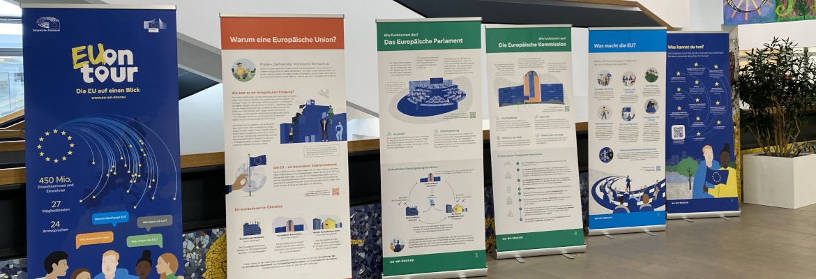 Diese Fragen werden anschaulich und knapp in der Wanderausstellung „EU on tour“, die von der Europäischen Union kostenlos zur Verfügung gestellt wird, beantwortet. Die Informationen können konkret in den Unterricht der Fächer Gemeinschaftskunde und Wirtschaft eingebunden werden, darüber hinaus lädt ein Quiz alle Schülerinnen und Schüler dazu ein, mit Hilfe von zehn Fragen ihr Wissen rund um die EU zu erweitern.